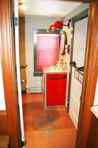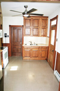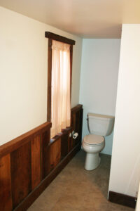 • Bathroom (6′ x 13’4″) – Vanity, Wall Cupboard, Toilet, Shower, Rustic Board Wall, Vinyl Floor