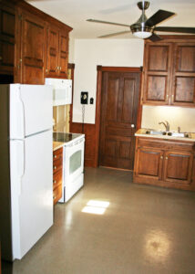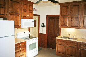 • Kitchen (9’4″ x 13’11”) – Sixteen (16) Handle Handcrafted Jeffery Spangler Raised Panel Cabinet Doors, Built-In G.E. Microwave Oven, G.E. Flattop Stove/Oven, G.E. Two (2) Door Refrigerator, Garbage Disposal, Ceiling Fan, Painted Walls & Panel w/ Chair Rail, Vinyl Floor, Basement Access