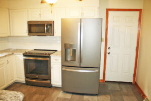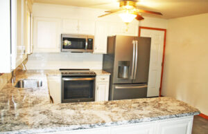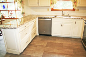 - Kitchen/Dining Area (13’4″ x 20’11”) – Kitchen Area – Modern Painted White Twenty-Two (22) Handle Built-In Cabinets, Granite Counter Tops, Tile Backsplash, Soft-Close Drawers, Lazy Susan, G.E. Profile Side-By-Side Refrigerator w/ Bottom Drawer Freezer, G.E. Flat-Top Stove & Oven w/ Wifi, G.E. Built-In Microwave, G.E. Profile Built-In Dishwasher, Ceiling Fan, Painted Walls, Vinyl Plank Floor – Dining Area – Bay Window, Leaded Stain Glass Hanging Lamp, Painted Walls, Vinyl Plank Floor
