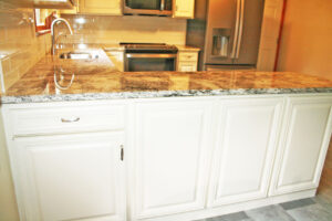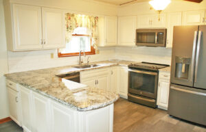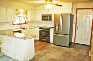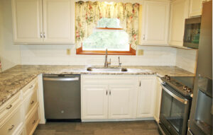 - Kitchen/Dining Area (13’4″ x 20’11”) – Kitchen Area – Modern Painted White Twenty-Two (22) Handle Built-In Cabinets, Granite Counter Tops, Tile Backsplash, Soft-Close Drawers, Lazy Susan, G.E. Profile Side-By-Side Refrigerator w/ Bottom Drawer Freezer, G.E. Flat-Top Stove & Oven w/ Wifi, G.E. Built-In Microwave, G.E. Profile Built-In Dishwasher, Ceiling Fan, Painted Walls, Vinyl Plank Floor – Dining Area – Bay Window, Leaded Stain Glass Hanging Lamp, Painted Walls, Vinyl Plank Floor