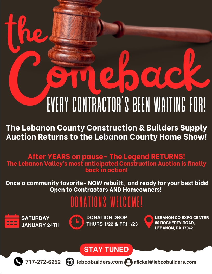 Saturday, January 24, 2026 – ON-SITE – Lebanon Co. Builder’s Association – Construction Builders Supply Public Auction