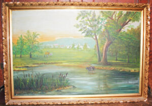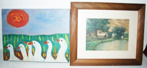 PAINTINGS: Log Cabin Homestead Oil On Board Painting, B.S. 2008 “Pumpkin Days” Print 14/30, B.S. Painting “Be Kind Good”, Oil On Board “Roses” w/ Ornate Gold Gilt Frame, Color Litho Homestead Print, Oil On Canvas “Geese With Son”, Various Assorted Pictures, Prints, Various Assorted Color Litho Victorian Prints, B.S. “Snow Family w/ Dog” Small Pictures, B.S. “Chicken” Small Pictures, B.S. 1991 “Mary Becker Age 102”, B.S. “Indian Rowing Boat w/ Mountain Scene”, B.S. “Star Wars” Painting On Board, Various Assortment of B.S. Paintings Consisting of Oil On Canvas, Board, Sizes From Very Small to Large, Barbara Mock “Seed Print”, B.S. “Turkey” Painting On Board, B.S. “Bagging Potatoes”, B.S. “Red Bridge Village Annie Reed Green” Oil On Canvas, Jeff Marks Reinholds Chapel Print, B.S. 2000 “Chick & Egg” Painting, Color Litho Print “The Parable Of The Lily” In Gold Gilt Frame (Overall 33″ x 42″), Framed Barbara Strawser “Belsnickel” Painting, Various Assortment of Paintings & Sizes, Large Barbara Strawser Paintings, Other Items