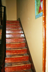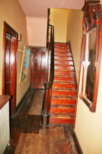 - Hallway (5′ x 23’9″) – Wooden Victorian Curved Banister Spindle Stairway (3′ x16′) w/ Landing Area, Hanging Slag Glass Hall Lamp, Wood Floor, Hall Understairs Closet (2’4″ x 8′)