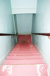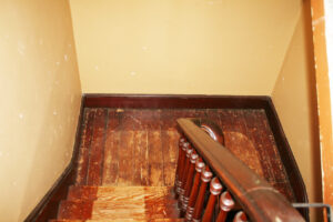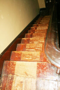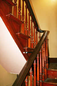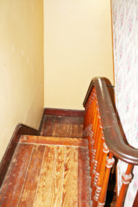 - Stairs (2′ x 10’4″) – Wooden Victorian Curved Banister Spindle Staircase, Painted Wallpaper Walls, Wood Floor