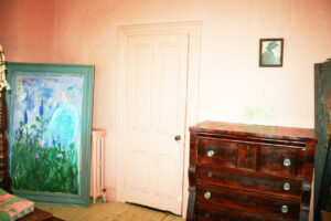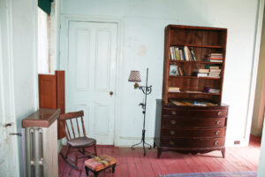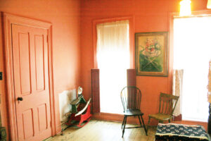 - Front Parlor #2 (12’6″ x 14′) – Frosted Shade Hanging Lamp, Arched Raised Panel Pocket Doors, Painted Walls, Painted Wood Floor, Access to Dining Room