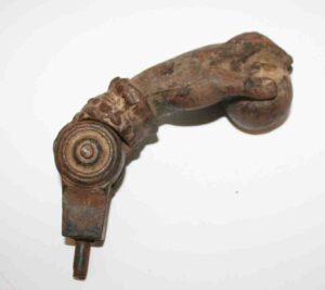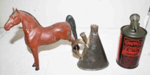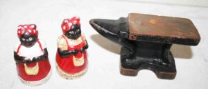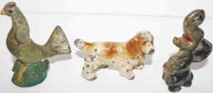 Cast Metal Banks (William Tell Mechanical Bank Patd. June 22, 1898, Trick Dog Mechanical Bank Patd. July 31, 1888, Log Cabin Bank), Cast Metal Uncle Sam & Arab Oil Mechanical John Wright Bank, Early Cast Iron Sailor Carrying Match Safe, Cast Iron (Early Hand & Ball Door Knocker, Lg. Dog Boot Scraper, Marietta Glue Pot, Aunt Jemima Bank & Small Aunt Jemima Banks, Fanner Mfg. Glue Pot, Dog), Cast Iron Hubley (Medium Size Horse, Rooster, Elephant Bottle Openers, Springer Dog), Cast Metal Hubley Horse, Small Cast Anvil,