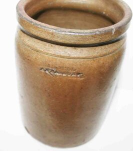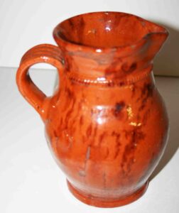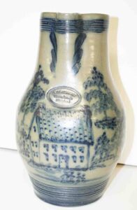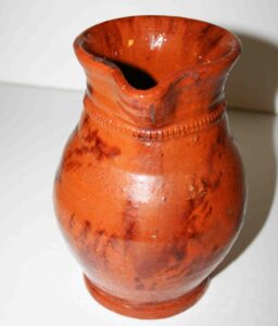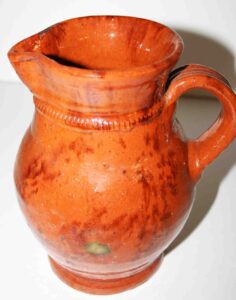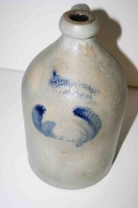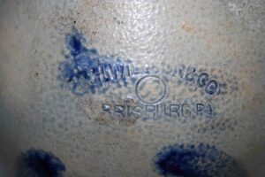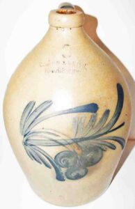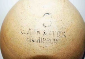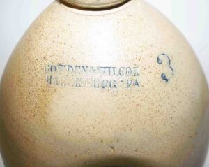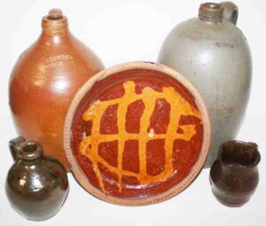 Stoneware: Cowden & Wilcox Three Gallon Blue Decorated Bird On Stump Jug, Cowden & Wilcox Colbalt Slip Decorated Three Cherries & Branch Three Gallon Jug, Cowden & Wilcox Harrisburg PA Brush Colbalt Floral Jug, N. Clark & Co Lyons Brush Colbalt Floral Three Gallon Double Handle Crock, T. H. Willson & Co Harrisburg PA Blue Decorated Jug, F. H. Cowden Handled Crock, Albany Glaze Pitcher, Wm. Hare Wilmington DE Cylinder Crock, F.H. Cowden Jug, Solomon Bell Strasburg VA Crock, Jacob Medinger Redware Handle Pitcher, Schofield Redware Jugs, Schofield Handle Pitcher, Ovid Handle Jug, Redware Tick Tack Pie Plate, John Bell Waynesboro Stoneware Crock, Large Beaumont Blue Salt Glaze Highly Decorated Stoneware Handled Pitcher, Large 5 Gallon Stoneware Jug