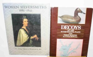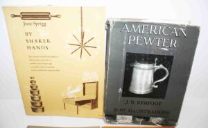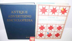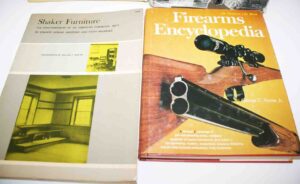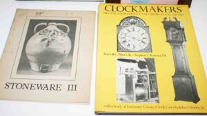 Books/Reference Books: With Hammer to Hand – Hummel, History of Lancaster County – Ellis Evans, Clockmakers – John J. Snyder Jr., Stoneware III, Women Silversmiths – Glanville Goldsborough, Decoys – J. Evans McKinney, Decorated Stoneware of Cowden – Matthew R. Miller, Big Ware Turners – Phil Schaltonbrand, Decorated Stoneware Pottery Of North America – Tuttle, A Museum of Early American Tools – Eric Sloane, Gun Digest, By Shaker Hands – June Sprigg, American Pewter – J.B. Kerfoot, Shaker Furniture – Edward Deming, Andrew & Faith Andrews, Firearm Encyclopedia, The Gun And It’s Development – W. W. Greener, The Pennsylvania Kentucky Rifle – Henry J. Kauffman, Japanese Prints – James A. Michener, Colonial Furniture In America – Luke Vincent Lockwood, History of Bucktails – Thompson, Rauch Morningside, Diary of An Early American Boy – Eric Sloane, Pennsylvania German Fraktur #1, Pennsylvania Clocks – Eckhardt, Bonanza, Folk Art of Rural Pennsylvania – Frances Lichten, Antique Advertising Encyclopedia – Roy Klug, America’s Quilts and Coverlets – Stafford, Bishop, Master of Modern Art, Firearms – Martin Miller, Witness To The Civil War, Leather Bound Burns Tennyson Book, Will Rogers Book, A Variety of Reference Books, Price Guides, Other Books
