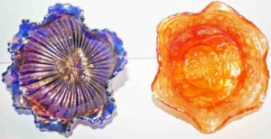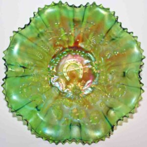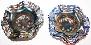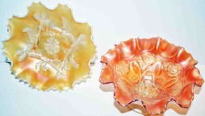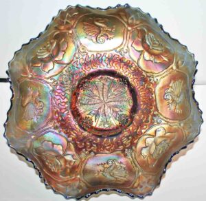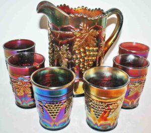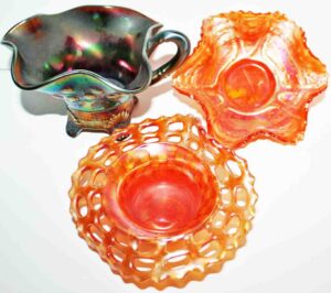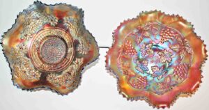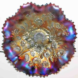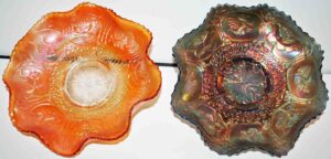 Carnival Glass: Amythest Three Fruit Plate, Marigold Foot Orange Tree Bowl, (2) Amythest Three Fruit Bowls, Marigold Bowls, Northwood Marigold Bowl, Peach Opalescent Dogwood Bowl, Green Horseshoe Good Luck Bowl, Amythest Butterfly Nappie, Green Holly Candy Dish, Marigold Panther Nappie, Marigold Ruffled Edge, Northwood Amythest Black Berry Creamer, Marigold Three Fruit Small Double Handle Footed Compote, Amythest Cherry Bowl, Amythest Footed Rose Bowl, Marigold Grape & Cable Bowl, Marigold Ruffled Edge Bowl, Colbalt Blue Lotus & Dragon Bowl, Marigold Footed Wind Mill Bowl, Imperial Lustre Rose Footed Bowl, Blue Lotus & Dragon Bowl, Marigold Lotus & Dragon Bowl, Amythest Grape & Cable Bowl, Pr. Amythest Black Berry Ruffled Edge Dishes, Colbalt Orange Tree Bowl, Amythest Grape & Cable Water Set Pitcher w/ Six Tumblers