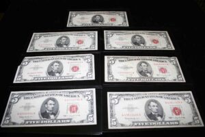 Currency/Coins: Silver Certificate $1, $2, $5, Blue & Red Seal, (Note Many Bills Very Crisp), Silver Kennedy Half Dollar, Silver Standing Liberty Quarters, Washington Quarters, Barber Quarter, Barber Dimes, Buffalo Nickel & V-Nickels, 1868 Seated Dime, State Quarters, Wheat Pennies, Indian Head Pennies, Foreign Coins