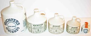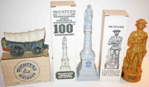 Collection of Michter’s Decanters/Advertising Bottles: Fleetwood Packard, Sour Mash, Pot Still, World’s Fair, Pennsylvania State Firearms Assoc. Doughboy, 1753 Jugs, York Pullman Car, 59th National Convention, Ice Wagon, Liberty Bell, King & Queen, Stagecoach, George Washington, Witch Decanters, King Tut & Queen Nefertiti Pitchers, Beam’s Curved Dash Oldsmobile, Fink’s Harrisburg PA & The Deppen Brewing Reading PA, Penn, American, Hi-Ho, Hires Beverage Bottles, Assorted Medicine Bottles