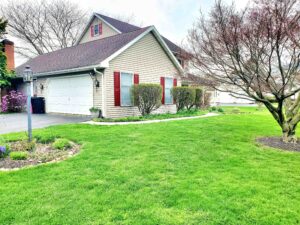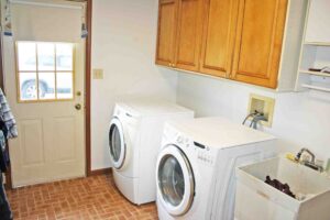 - Laundry Area (7’6″ x 12′) – Whirlpool Washer & Dryer, Fiberglass Laundry Tub, Built-In Cabinets, Painted Walls, Wallpaper Border, Vinyl Floor, Service Door