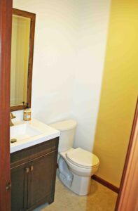 - Powder Room (4’10” x 5’2″) – Painted Walls, Vinyl Floor