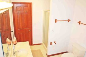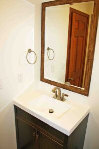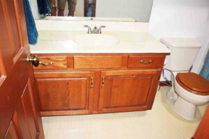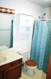 - Full Size Bathroom (5′ x 9’6″) – Oak Vanity, Tub/Shower, Toilet, Painted Walls, Vinyl Floor