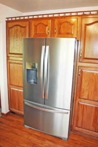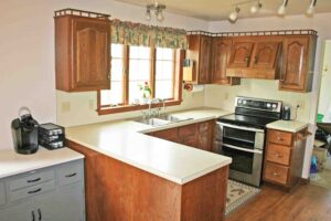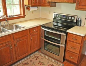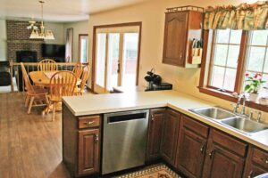 - Kitchen (11′ x 24′) – Eat-In Area, Modern Oak Thirty-Four (34) Handle Built-In Cabinets, Pantry, Lazy Susan, Stainless Steel Whirlpool Double Door Refrigerator, Kitchen Aid Dishwasher, Whirlpool Flattop Stove/Oven, Painted Walls, Laminate Floor, Access To Rear Wooden Deck