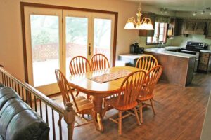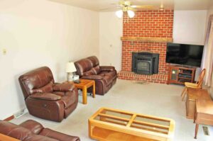 - Step-Down Livingroom (13’6″ x 21′) – Brick Fireplace w/ Pellet Stove Insert, Ceiling Fan, Painted Walls, Wall To Wall Carpet, Access To Rear Wooden Deck