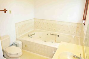 - Master Bathroom (7′ x 12′) – American Standard Jacuzzi Whirlpool Tub w/ Tile Surround, Shower, Toilet, Vanity, Painted Walls, Vinyl Floor