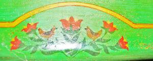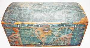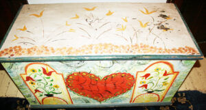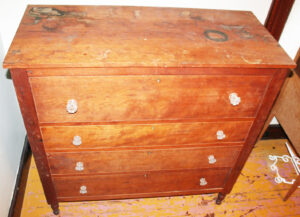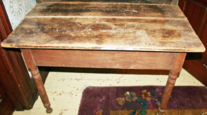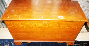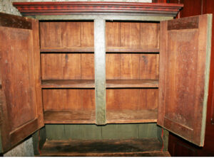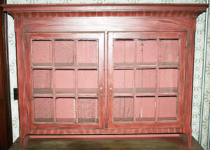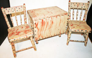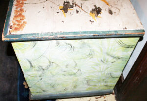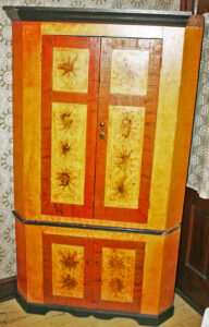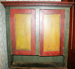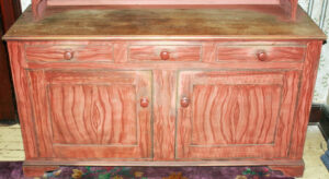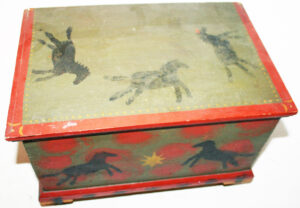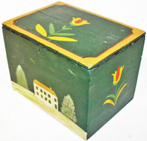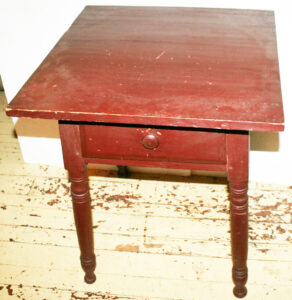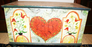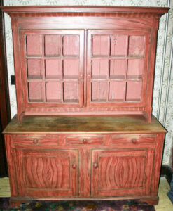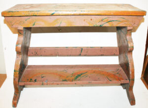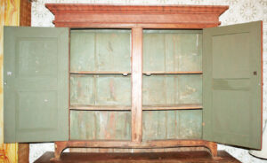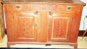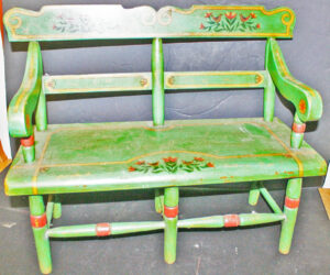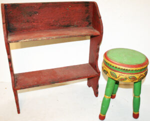 FURNITURE: Grain Decorated Two (2) Part Panel Door Step-Back Cupboard Softwood (87″H Overall – Top Part 51″L x 10.5″D x 47″H, Bottom Part 62″L x 22″W x 39″H, Top – Two (2) Panel Doors w/ Green Paint Interior, Spoon Rest, Fluted Cornice, Base – Three (3) Drawers w Oval Pulls Over Two (2) Raised Panel Doors, Bracket Feet), Paint Decorated Two (2) Part Four (4) Panel Softwood Corner Cupboard (Painted Interior w/ Plate Rack, Base w/ Scalloped Front, Cornice Molding – 1-Side Missing Cornice On Base & Top), Painted Mortised Crock Bench (26″L x 21.5″H x 10″W), Tramp Art One (1) Drawer Stand 25″H x 16″, Tombstone & Heart Paint Decorated Softwood Lift-Lid Blanket Chest w/ Till & Turned Feet (Re-Decorated) (44″L x 21″D x 26″H), Grain Decorated Softwood Blanket Chest w/ Till & Bracket Feet (44″L x 21″D x 26″H), Sheraton Panel End Chest Of Drawers w/ Turned Feet & Glass Pulls (20″D x 44″H x 45″L), Red & Green Paint Wooden Three (3) Tier Display/Plant Stand (29″H x 31″W), 2 Over 3 Paint Decorated Chest Of Drawers (41″L x 21″D x 40″H), Windsor Spindle Back Side Chair 34″H, One (1) Drawer Stand w/ Overlapping Top & Turned Legs (24″ x 24″ x 29″H), Splay Leg Turned Pedestal Stand (27″H x 19″ x 19″), Red & Green Paint Decorated Fluted Cornice Cupboard Top (45″H x 46″L x 11″Deep), Three (3) Board Scrub Top Table w/ Turned Legs (34″W x 42″L x 29″H), Walnut One (1) Drawer Drop Leaf Table (36″L x 45″W x 29″H), Walnut Scalloped Leaves Drop Leaf Table w/ Casters (46″L x 46″W x 26″H), Painted Softwood Two (2) Part Step Back Cupboard (Top Part – Two (2) Door Eighteen (18) Pane, Fluted Cornice, Painted Salmon Interior Plate Rail, Spoon Rest (23″D x 83″H x 66″L) Wooden Knobs, Base – Three (3) Drawers over Two (2) Panel Doors, Bracket Feet, Wooden Knobs), Child’s Paint Decorated Plank Seat Settee By P. Shearer (26″L x 11..5″ x 21.5″H), Red Paint Miniature Bucket Bench, Paint Decorated Wooden Stool, Paint Decorated Horses & Star Child’s Trinket Chest w/ Turned Feet (14″L x 9.5″W x 9″H), Paint Decorated Wood Saffron Turning, Pair of Sheraton Style Banquet Table Ends w/ Drawer