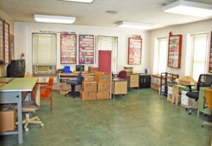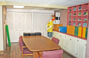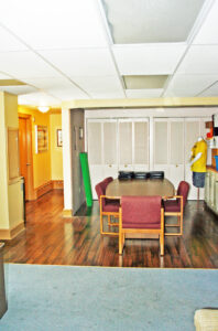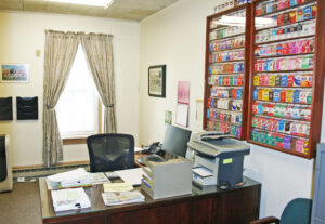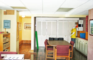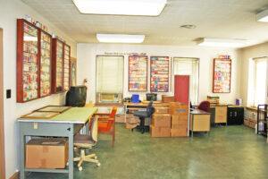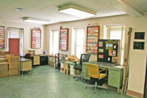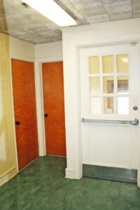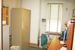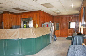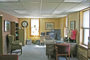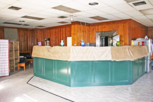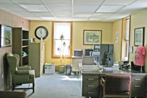 - Main Room (20’10” x 40′ & 15’2″ x 22’8″) – Knotty Pine Board, Vinyl Flooring & Carpet, Drop Ceiling, Counter w/ Undercounter Mosler Files & Safe
