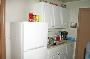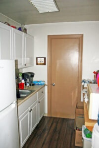 - Lunch Area (8′ x 6’6″) – Built-In Modern Cabinets, Sink, Counter, Painted Walls, Laminate Floor