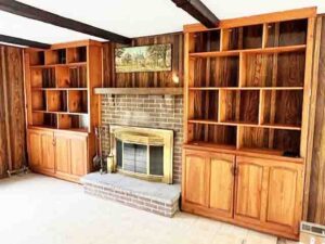 - Family Room (15′ x 12′) – Brick Fireplace, 8′ Ceiling, Paneled w/ Beams, Vinyl Floor